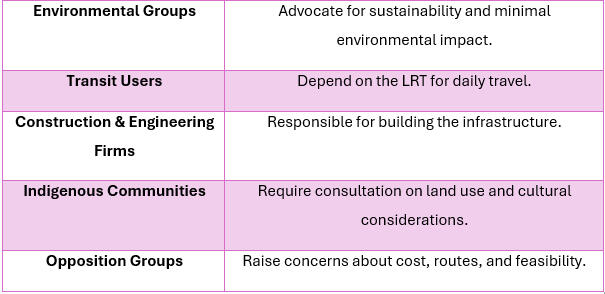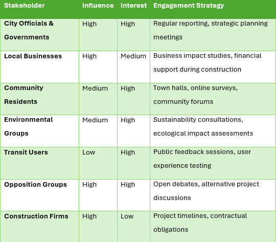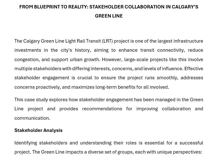 The Calgary Green Line Light Rail Transit (LRT) project is one of the largest infrastructure investments in the city's history, aiming to enhance transit connectivity, reduce congestion, and support urban growth. However, large-scale projects like this involve multiple stakeholders with differing interests, concerns, and levels of influence. Effective stakeholder engagement is crucial to ensure the project runs smoothly, addresses concerns proactively, and maximizes long-term benefits for all involved.