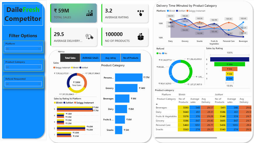 To conduct a competitor Analysis of DaileFresh, they are: Swiggy Instamart, Blinkit and Jiomart’s sales performance, customer satisfaction, and inventory distribution to identity key insights and opportunities for optimization using various KPIs and visualizations in Power BI.