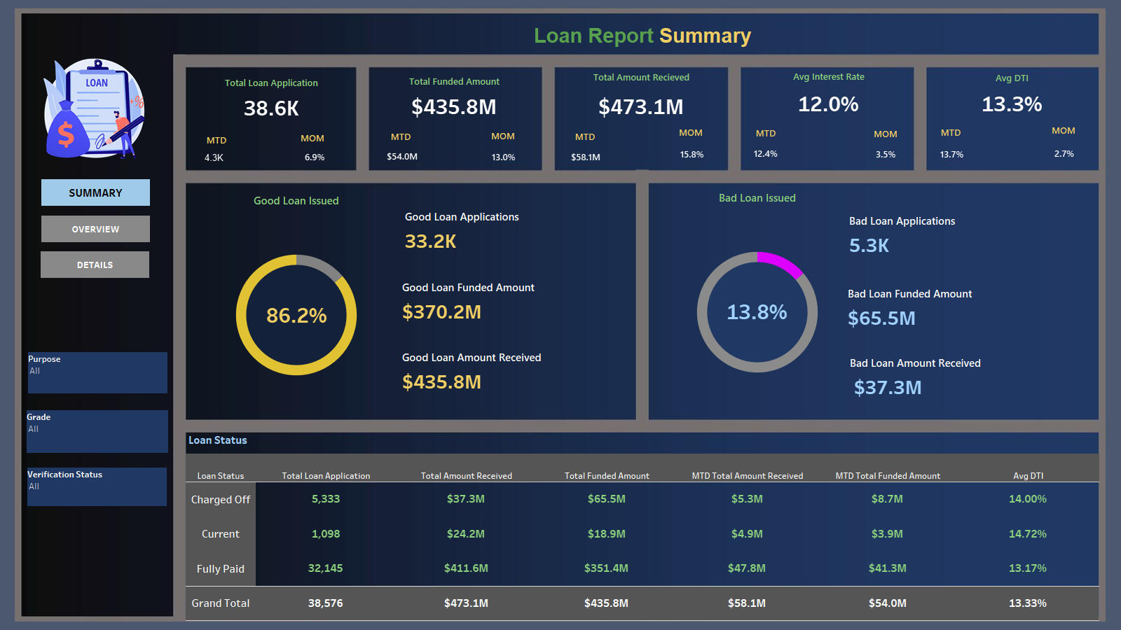 In order to gain a comprehensive overview of our lending operations and monitor the performance of loans, we aim to create a grid view report categorized by 'Loan Status.' This report will serve as a valuable tool for analysing and understanding the key indicators associated with different loan statuses. By providing insights into metrics such as 'Total Loan Applications,' 'Total Funded Amount,' 'Total Amount Received,' 'Month-to-Date (MTD) Funded Amount,' 'MTD Amount Received,' 'Average Interest Rate,' and 'Average Debt-to-Income Ratio (DTI),' this grid view will empower us to make data-driven decisions and assess the health of our loan portfolio.