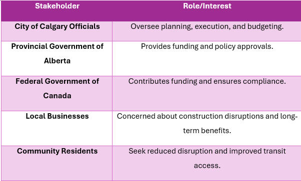 • City of Calgary Officials – Need to ensure the project is delivered on time and within budget while maintaining public support.