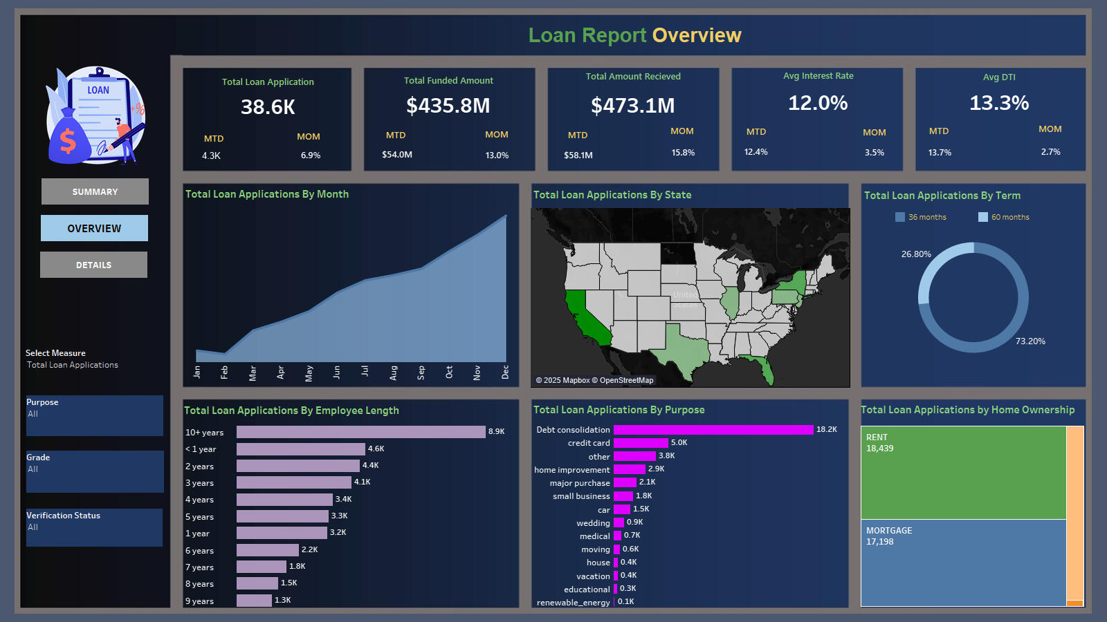 Metrics: 'Total Loan Applications,' 'Total Funded Amount,' and 'Total Amount Received'