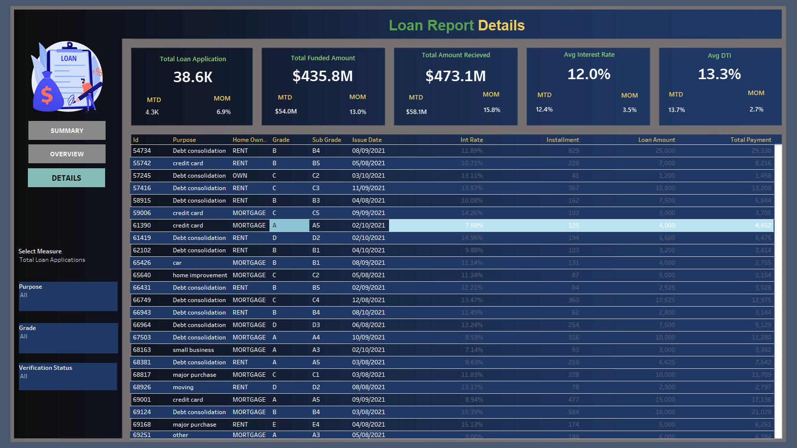 The primary objective of the Details Dashboard is to provide a comprehensive and user-friendly interface for accessing vital loan data. It will serve as a one-stop solution for users seeking detailed insights into our loan portfolio, borrower profiles, and loan performance.The dashboard is completely dynamic and adjusts depending on the Filter options.To Watch the demo of the Power BI dashboard, click the link down below.
